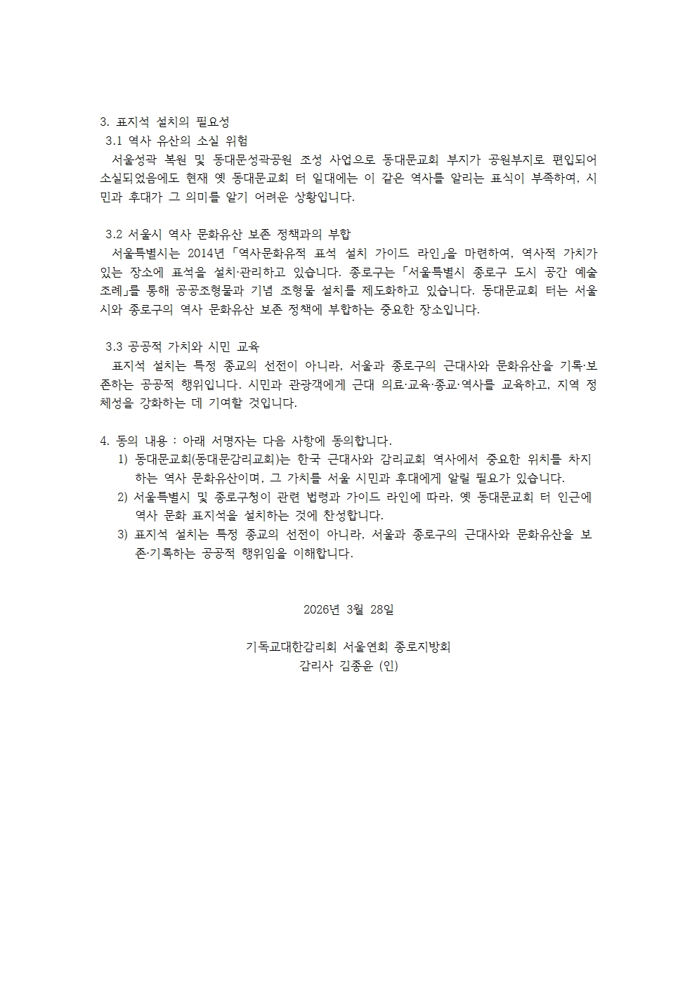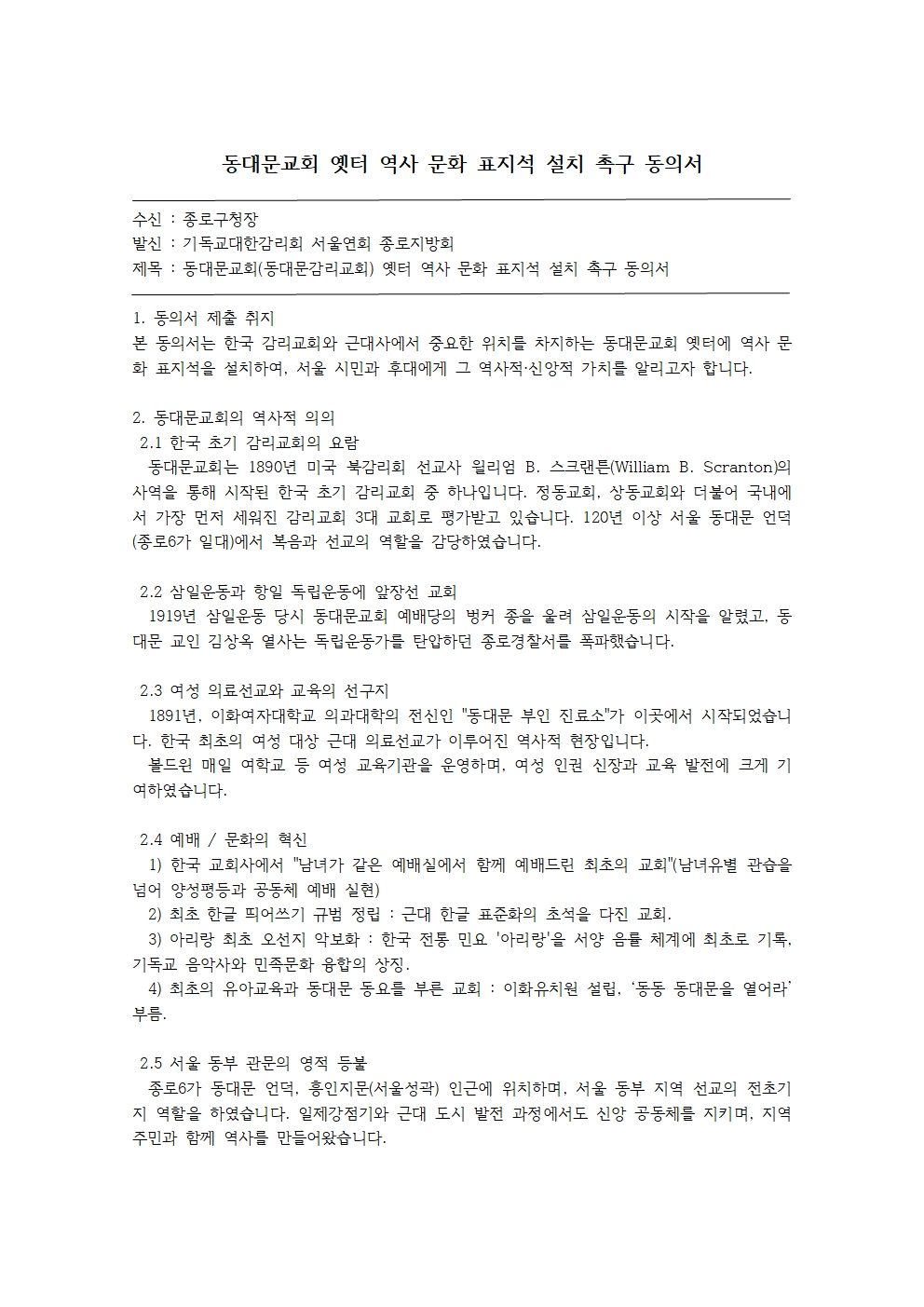 동대문교회 역사문화 표지석 설치 동의서